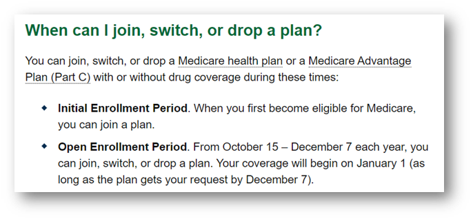 The Annual Election Period (AEP) is a time where one can change Medicare Advantage plans. AEP runs from October 15th to December 7th every year. If you don’t like the company you are with, you can freely change to another company. For more information on the Annual Election Period, please contact one of our brokers.
