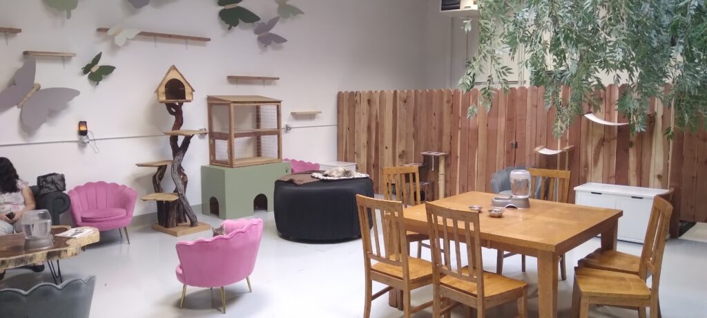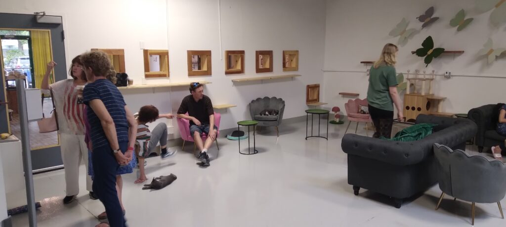 My wife and I stopped by at around noon. About 5 other seniors were in the cat lounge. Each one had a cat paying full attention to them. Two ladies smiled as they softly waved feather toys at their “hosts”. Two others enjoyed petting their new partners. One was reading with a cat by her side. We found a cat by itself and had a seat by one. Looking around, I was surprised at the size of this place! For the first floor cat lounge we were in, I could tell that minds were at work here to make it a pussycat paradise. There’s room to roam, a tree, resting hammocks attached to walls, cat trees, cat houses, boxes with holes for kittens to hide and a bookcase with board games for people. Cat toys are scattered everywhere.