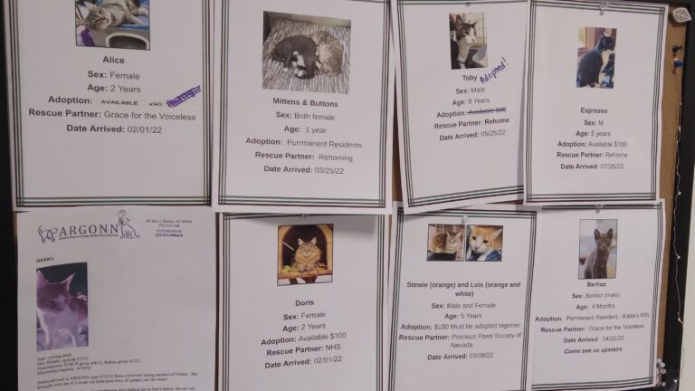 I guess you could say the cat lounge is like dating, but with cats! Maybe one will “choose” you! If you develop that special bond and are interested in adopting one, fill out an application. Kallie says all the cats in the lounge are adoptable and ready with “exams, microchips, spayed/neutered, vaccines…everybody’s good to go.” Where do they come from? Enchanted Cat Café partners with agencies like Animal Rescue Group of Northern Nevada (ARGONN) and Precious Paws Society of Northern Nevada in the Fallon/Fernley area. Since the café opened this year they’ve already done close to 75 adoptions.